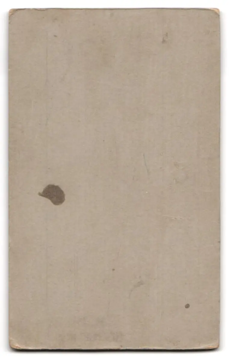 Diese CDV Fotografie präsentiert ein junges Kind, das liebevoll eine kleine Puppe in den Händen hält. Gekleidet in einem gestreiften Kleid mit einem weißen Spitzenkragen und stabilen Schuhen, steht das Kind vor einem schlichten Hintergrund, der die Aufmerksamkeit auf sein Gesicht und seine Haltung lenkt. Die ruhige Szene wird durch die zarte Geste, mit der das Kind die Puppe präsentiert, ergänzt., guter Zustand Größe ca. 6,5 x 11,0cm