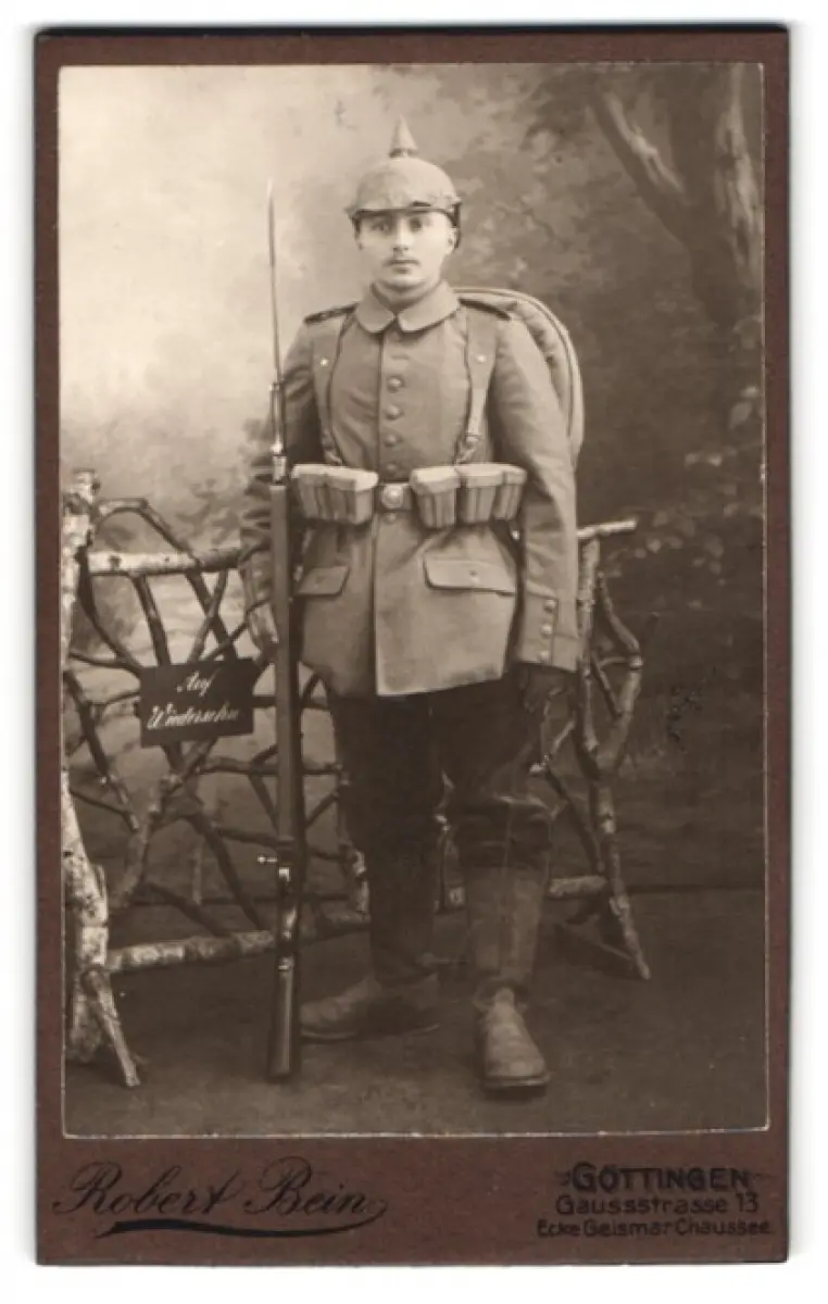Fotografie Robert Bein, Göttingen, Gaussstrasse 13, Infanterist mit Ausmarschgepäck, Pickelhaube und Gewehr