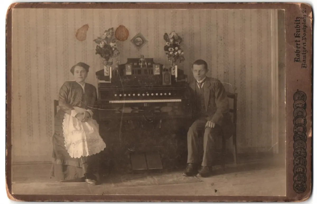 Fotografie Robert Kubitz, Bautzen, Frau und Mann mit ihrem Harmonium im Wohnzimmer