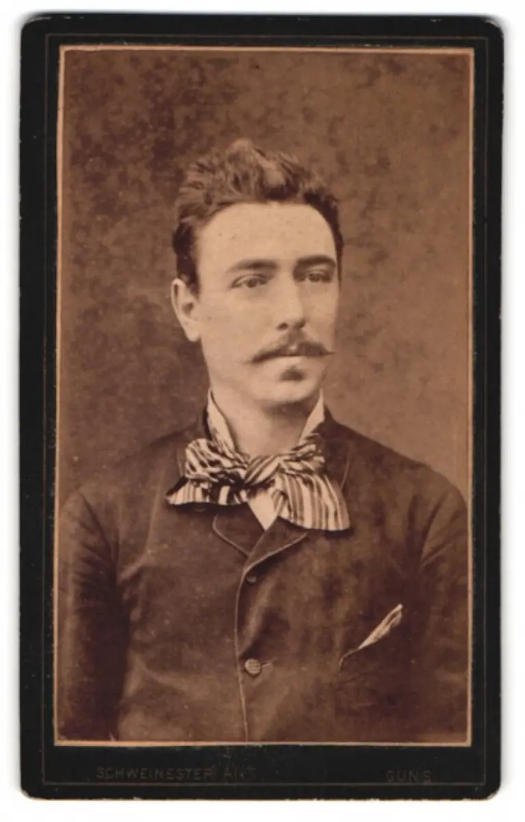 Diese Carte de Visite Fotografie zeigt einen eleganten Herrn mit markantem Schnurrbart und einem kunstvoll gebundenen Halstuch. Der Mann trägt einen klassischen Anzug und blickt mit ernster Miene in die Ferne. Der Hintergrund ist schlicht gehalten und lenkt den Fokus auf die ausdrucksstarke Erscheinung des Porträtierten., guter Zustand Größe ca. 7,0 x 11,0cm
