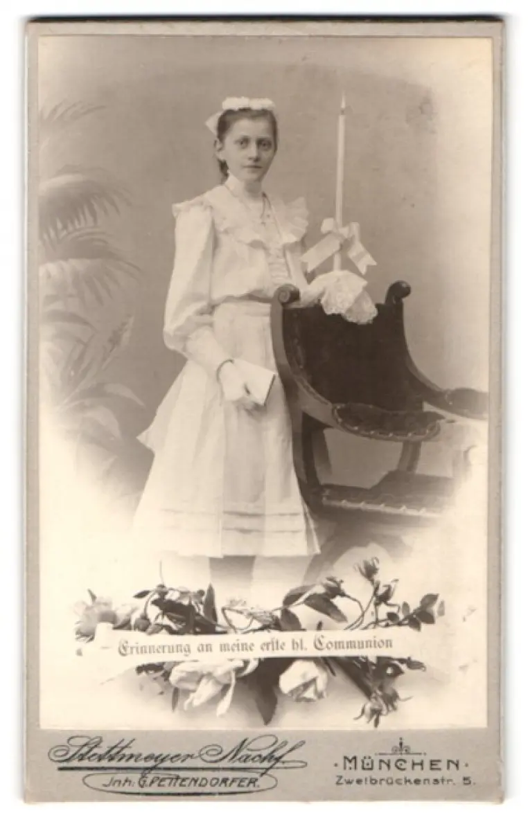 Fotografie Stettmeyer Nachf., München, Zweibrückenstr. 5, Kommunion Mädchen mit Kerze