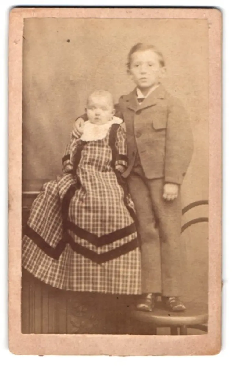 Auf dieser CDV Fotografie erblicken wir ein eindrucksvolles Porträt zweier Kinder, die uns in ihrer feierlichen Garderobe begegnen. Ein Junge, in einem eleganten Anzug gekleidet, steht standhaft auf einem Stuhl, während seine Hand liebevoll auf der Schulter eines kleinen Mädchens ruht, das in einem prachtvollen, karierten Kleid sitzt. Die Szenerie besticht durch ihre zeitlose Anmut und fängt einen Moment der Innigkeit und Ruhe ein., rückseitig Klebe- und Papierreste, guter Zustand