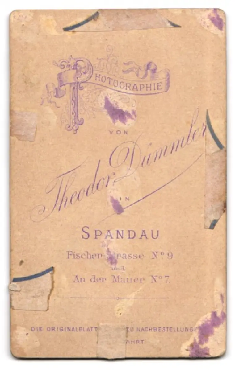 Auf dieser CDV Fotografie erblicken wir ein eindrucksvolles Porträt zweier Kinder, die uns in ihrer feierlichen Garderobe begegnen. Ein Junge, in einem eleganten Anzug gekleidet, steht standhaft auf einem Stuhl, während seine Hand liebevoll auf der Schulter eines kleinen Mädchens ruht, das in einem prachtvollen, karierten Kleid sitzt. Die Szenerie besticht durch ihre zeitlose Anmut und fängt einen Moment der Innigkeit und Ruhe ein., rückseitig Klebe- und Papierreste, guter Zustand Größe ca. 6,5 x 10,5cm