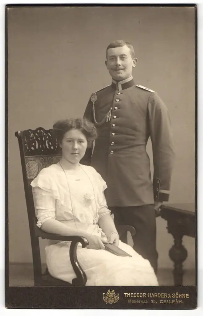 Fotografie Theodor Harder & Söhne, Celle, Uffz. in Uniform Rgt. 77 mit Schützenschnur nebst seiner Frau