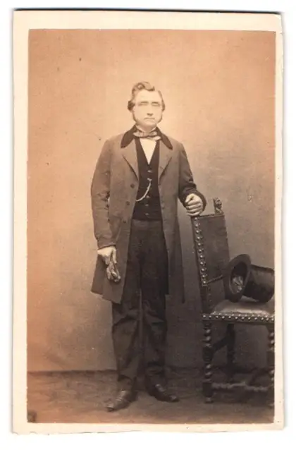 Fotografie Van Dennest, Anvers, Rue des Aveugles 5, Portrait älterer Herr im Anzug mit Fliege und Zylinder