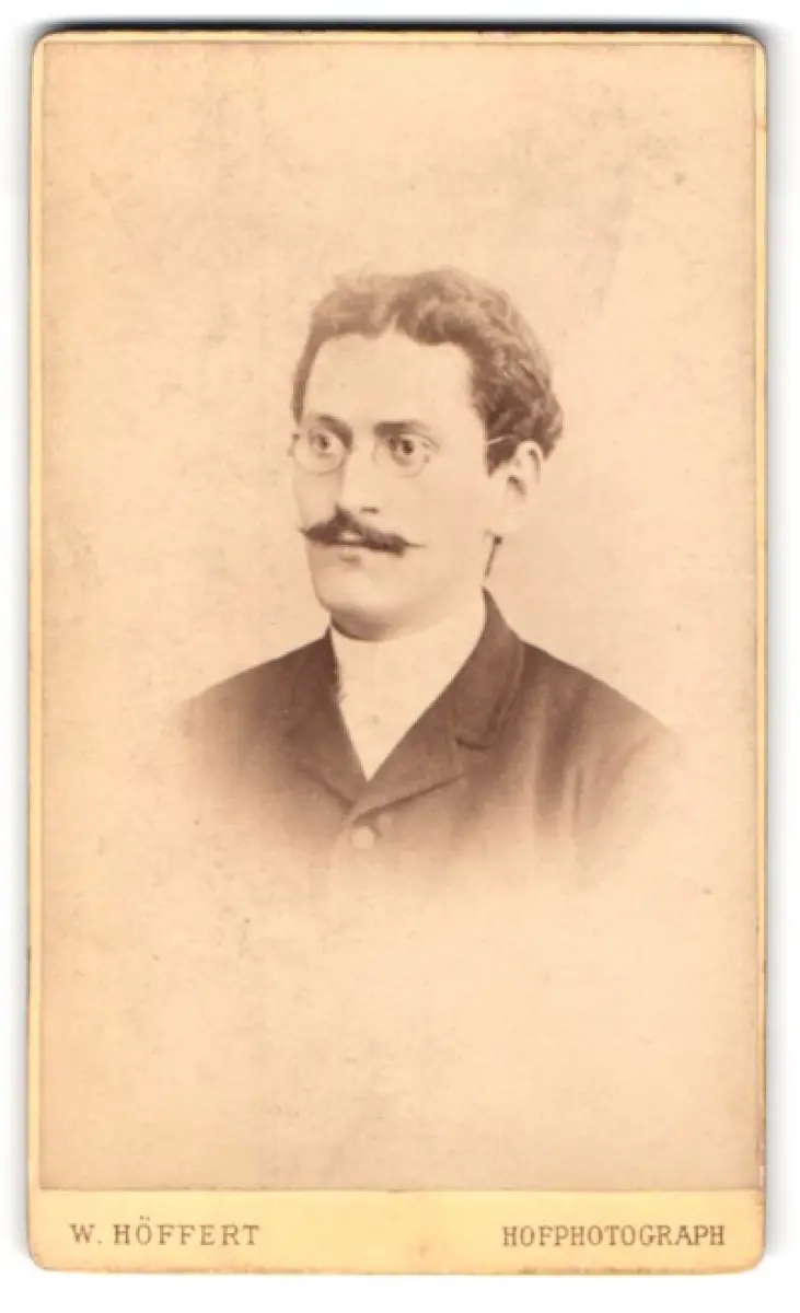 Diese CDV Fotografie fängt das Bild eines distinguierten Herrn mit markantem Schnurrbart und feiner Brille ein. Sein Blick strahlt Selbstbewusstsein aus, während er in einem eleganten Anzug mit hellem Hemd posiert. Der Hintergrund ist zart verblasst, wodurch das Porträt eine zeitlose Anmutung erhält. Ein fein gearbeitetes Beispiel aus der Ära der Visitenkartenfotografie., guter Zustand Größe ca. 6,5 x 11,0cm