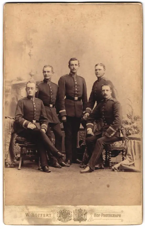 Fotografie W. Höffert, Ort unbekannt, Einjährig-Freiwillige Uffz. in Uniform posieren im Atelier