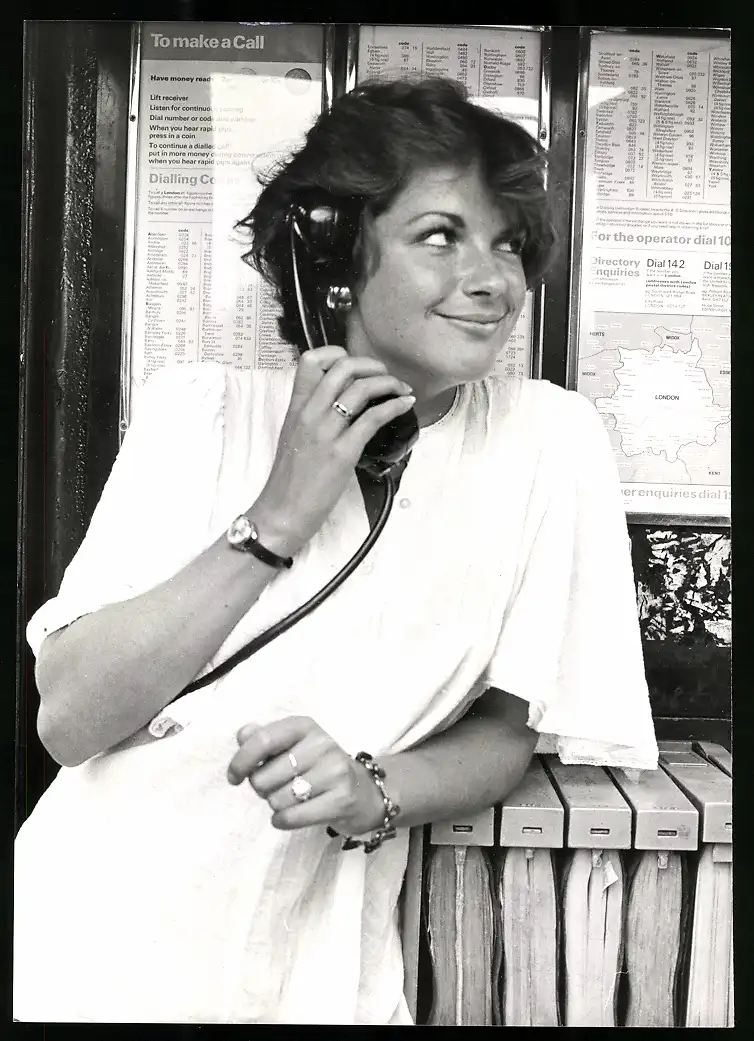 Fotografie britische Schauspielerin Mary Tamm in einer Telefonzelle, Grossformat 18 x 25cm