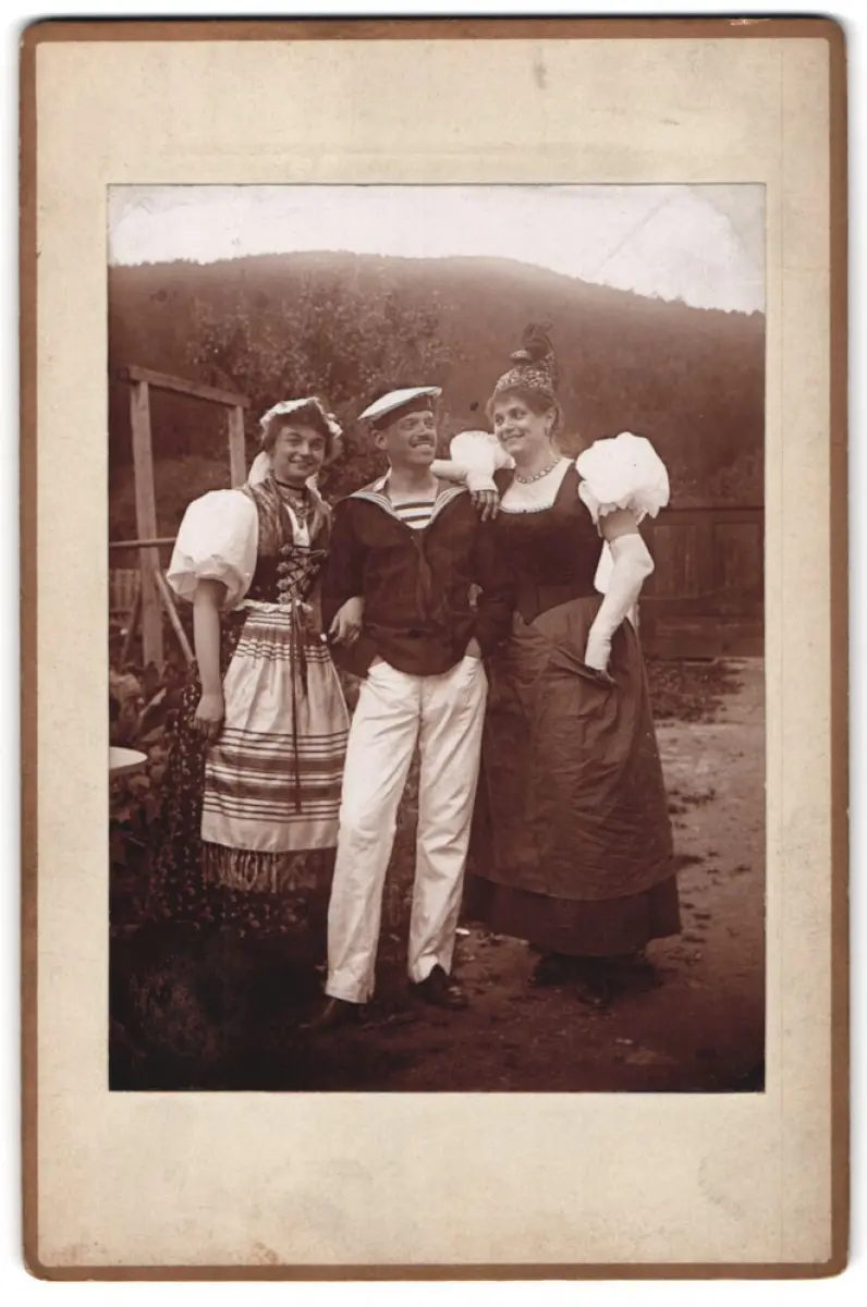 Fotografie junge Menschen zum Fasching in Kostümen als Matrose und in Tracht, 1896