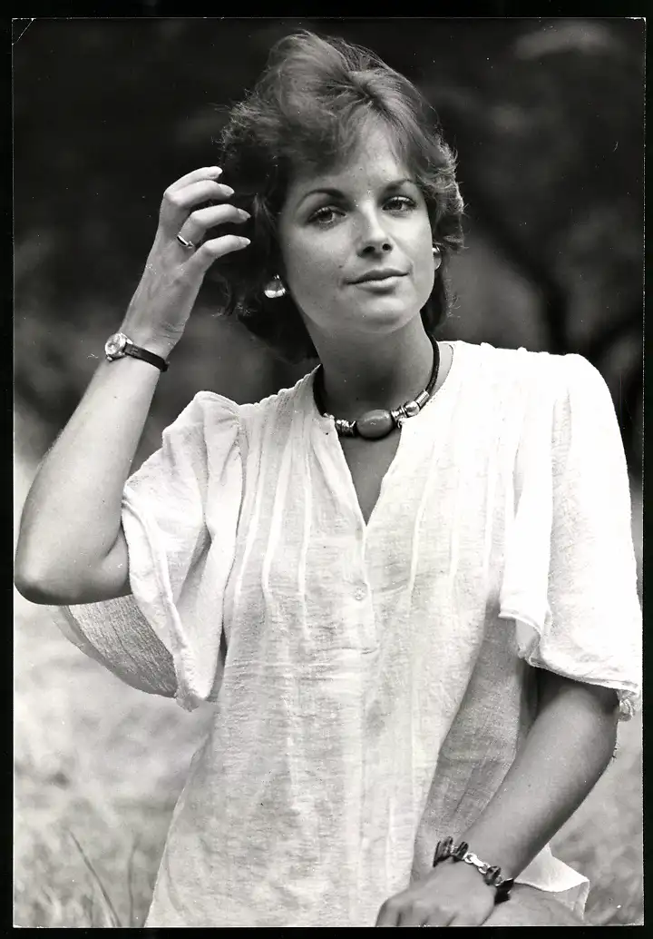 Fotografie junge Schauspielerin Mary Tamm im weissen Kleid mit Schmuck, Grossformat 18 x 25cm