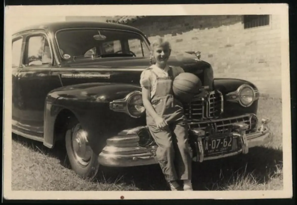 Fotografie junges Mädchen lehnt am Lincoln Continental, Kennzeichen A-07-62