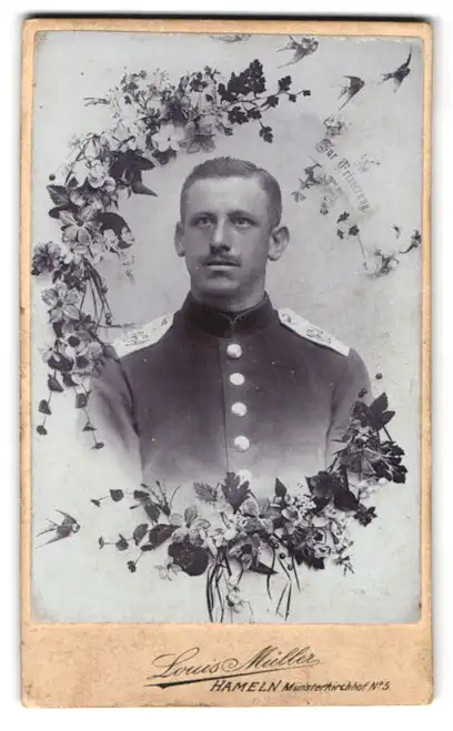 Fotografie louis Müller, Hameln, Soldat in Uniform Rgt. 164, im Passepartout mit Blumen
