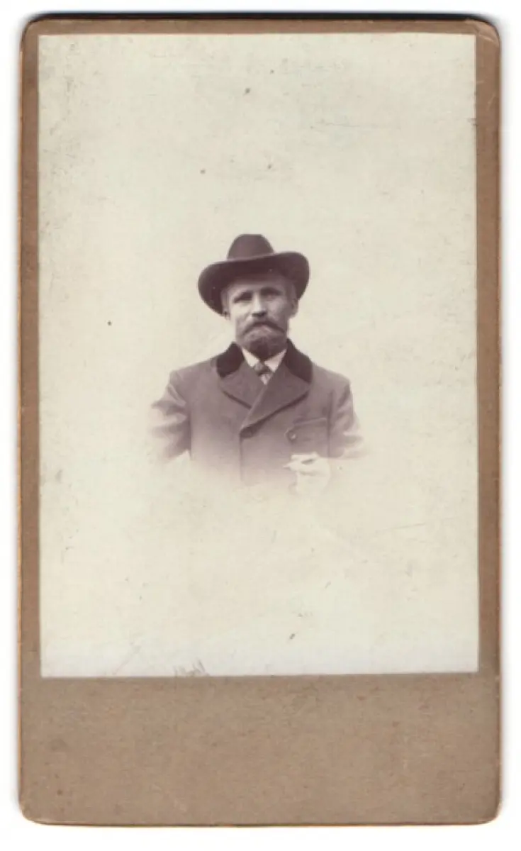 Diese CDV Fotografie zeigt einen würdevollen Mann mittleren Alters, der selbstbewusst in die Kamera blickt. Er trägt einen eleganten Mantel mit samtigem Kragen und einen stilvollen Hut, der seine Erscheinung abrundet. Sein Bart ist gepflegt, und die Haltung zeugt von einer zurückhaltenden Eleganz. Die dezente Farbgebung und der minimalistische Hintergrund lenken die gesamte Aufmerksamkeit auf das Gesicht des Dargestellten, wodurch seine Persönlichkeit eindrucksvoll zur Geltung kommt., guter Zustand