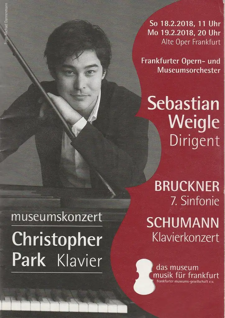 6. Sinfoniekonzert. Programm: ROBERT SCHUMANN: Konzert für Klavier und Orchester a-Moll op. 54. ANTON BRUCKNER: Sinfonie Nr. / E-Dur. Mitwirkende: Christopher Park, Klavier. Frankfurter Opern- und Museumsorchester. Dirigent: Sebastian Weigle. - Theaterprogramm, Opernprogramm, Ballettprogramm, Musicalprogramm, Konzertprogramm, Theatermemorabilia, Programmhefte Sammlung, deutsche Theatergeschichte.