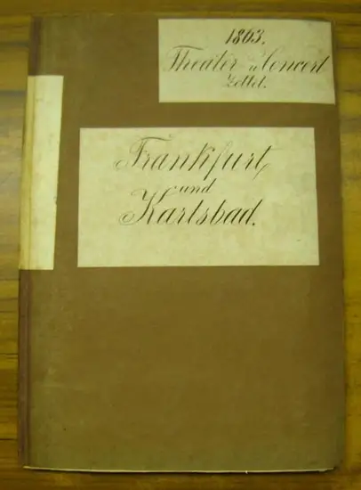 Frankfurt und Karlsbad. Theater- und ConcertZettel 1863: Sammelband mit insgesamt 162 Programmzetteln. - Enthalten: komplette Folge zu Aufführungen im Frankfurter Stadttheater vom 1. Januar bis 13. Mai, Abonnement-Vorstellungen 47 - 147 (einige ausser Abonnement) / 17 Zettel zu Vorstellungen im Theater in Karlsbad ( diese ohne Datierung ) / 1 Zettel Theater Würzburg, 5. Oktober / Vorstellungen im Theater Frankfurt vom 13. - 23. November, Nr. 13 - 23 / 5 Zettel für andere Veranstaltungen. - Mitwirkende: Concertmeister Heinrich Wolff / die Herren Moritz, Vollmer, Heussenstamm, Degen, Roll, Bürde, Zielfelder, Lanius, Lebrün, v. Kaminski, Diehl, Theodor Wachtel als Gast / Amedee de Vroye, Solo-Flötist vom königlichen Theater zu London / Fräulein Geisthardt, H. Müller, (Toni) Labitzki, Eichberger u. a. / Gäste: Johanna Dettmer, Marie Franziska Frisch, Frau Strassmann-Damböck vom Hoftheater in München, Friederike Gossmann
