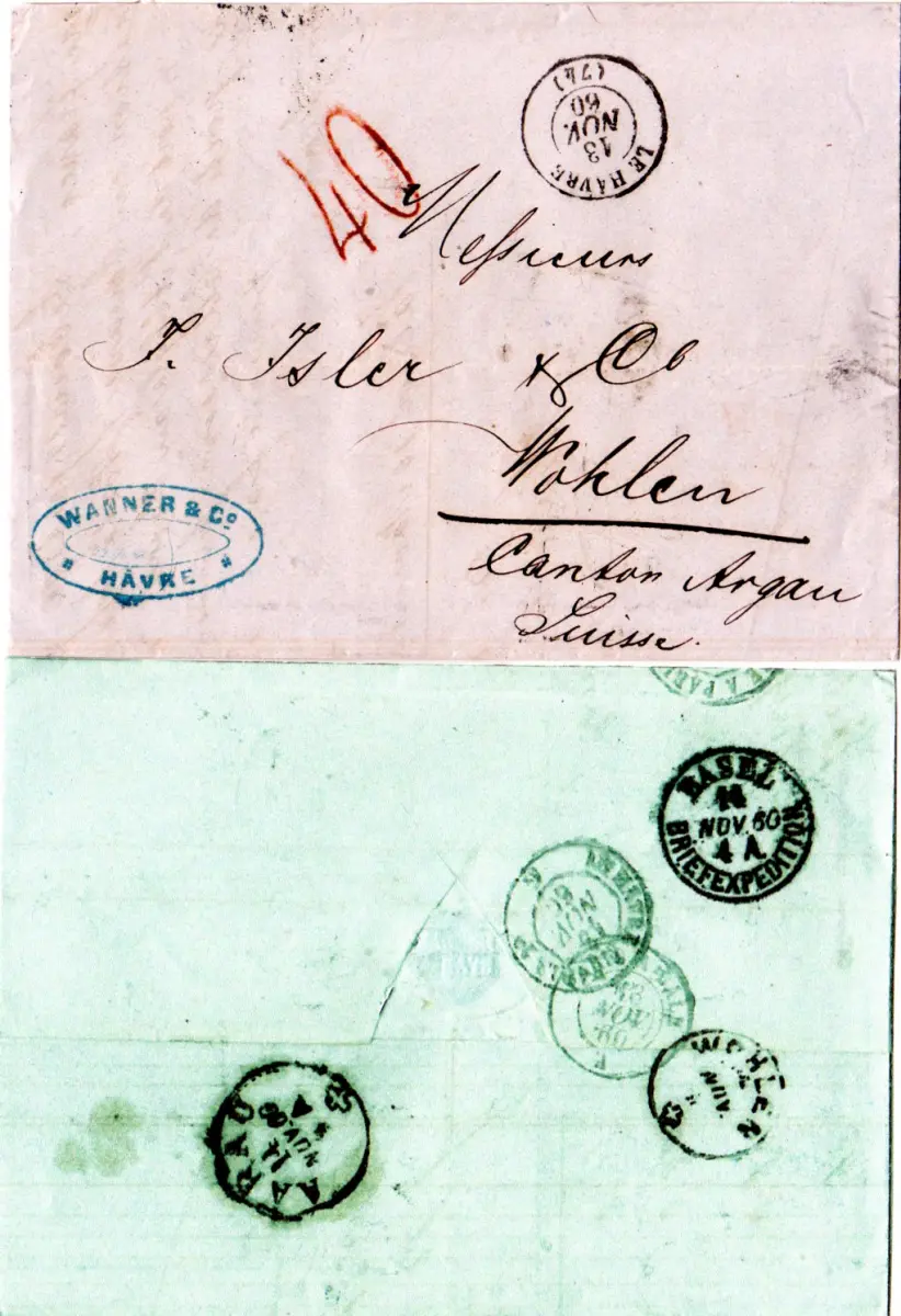 Frankreich 1860, Brief v. Le Havre m. rotem Schweiz Porto Stempel "40"