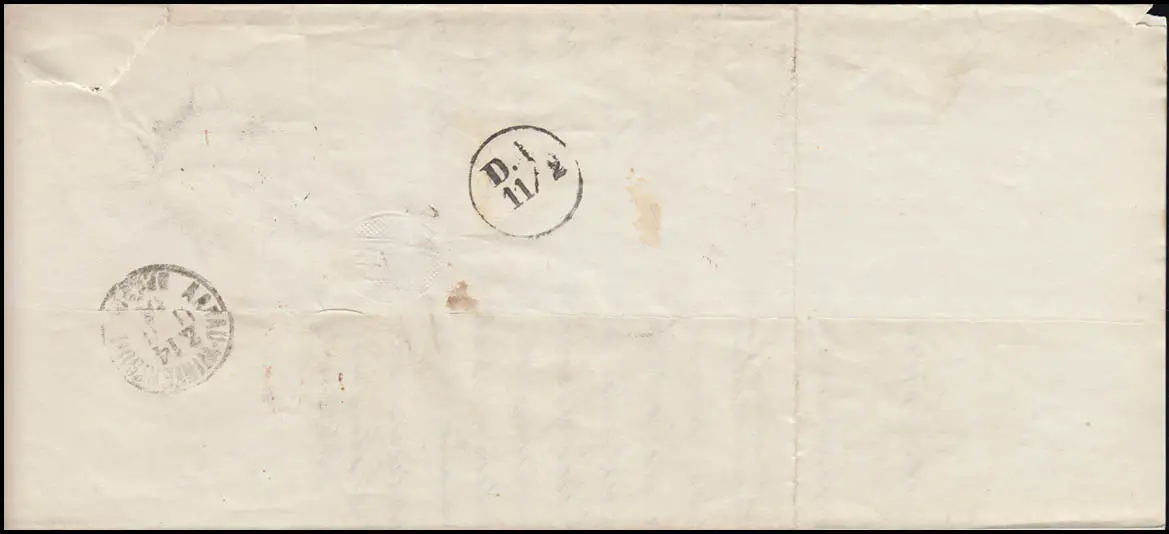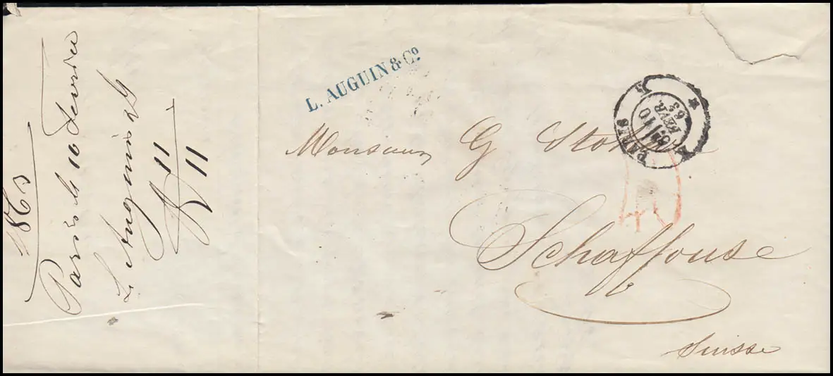 von der Firma L. AUGUIN & Co. / Ankunftsstempel AARAU-WINTERTHUR 11.2.1863 / Einkreisstempel "D 4 - 11/2", oben rechts Einriss alut Abbildung