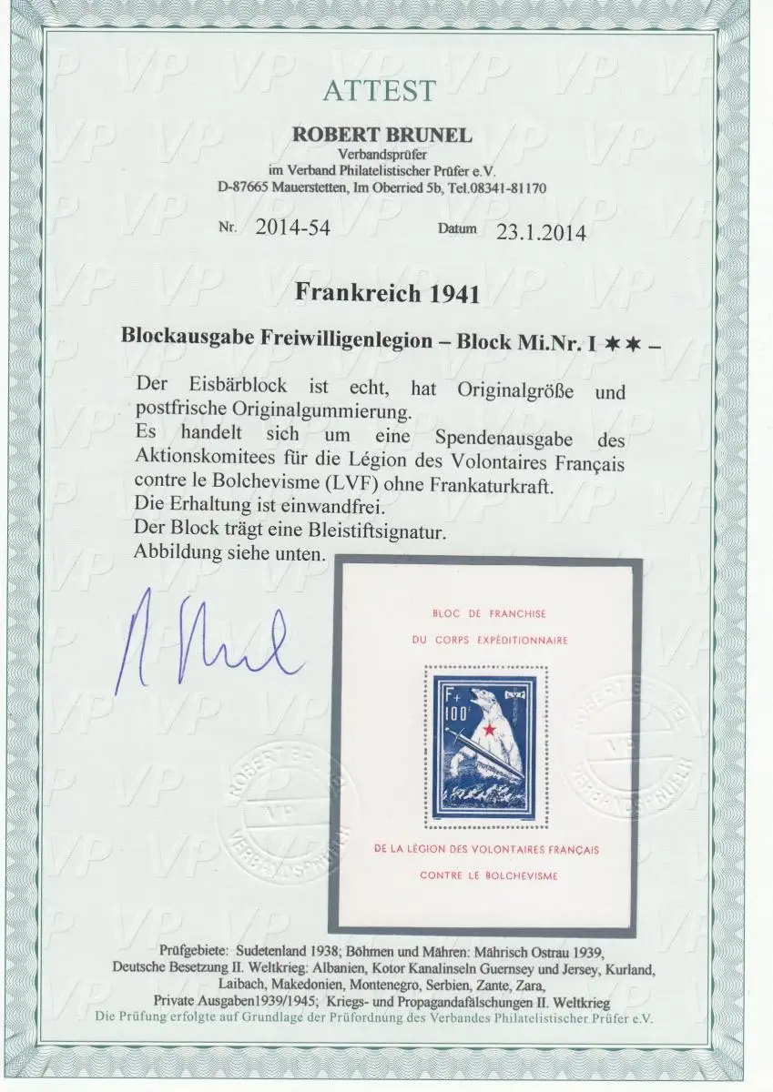 Frankreich: Freiwilligen Legion: BLock MiNr. I, postfrisch