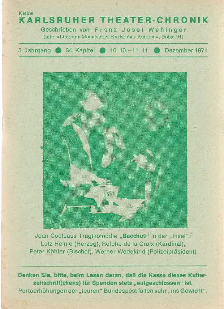 Franz Josef Wehinger: Kleine Karlsruher Theater-Chronik 5. Jahrgang 34. Kapitel 10. 10. - 11. 11. Dezember 1971.