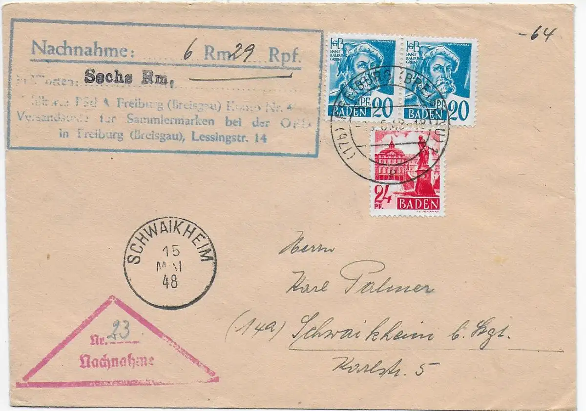 Franz. Zone 1948: Freiburg nach Schwaikheim, Nachnahme 1948