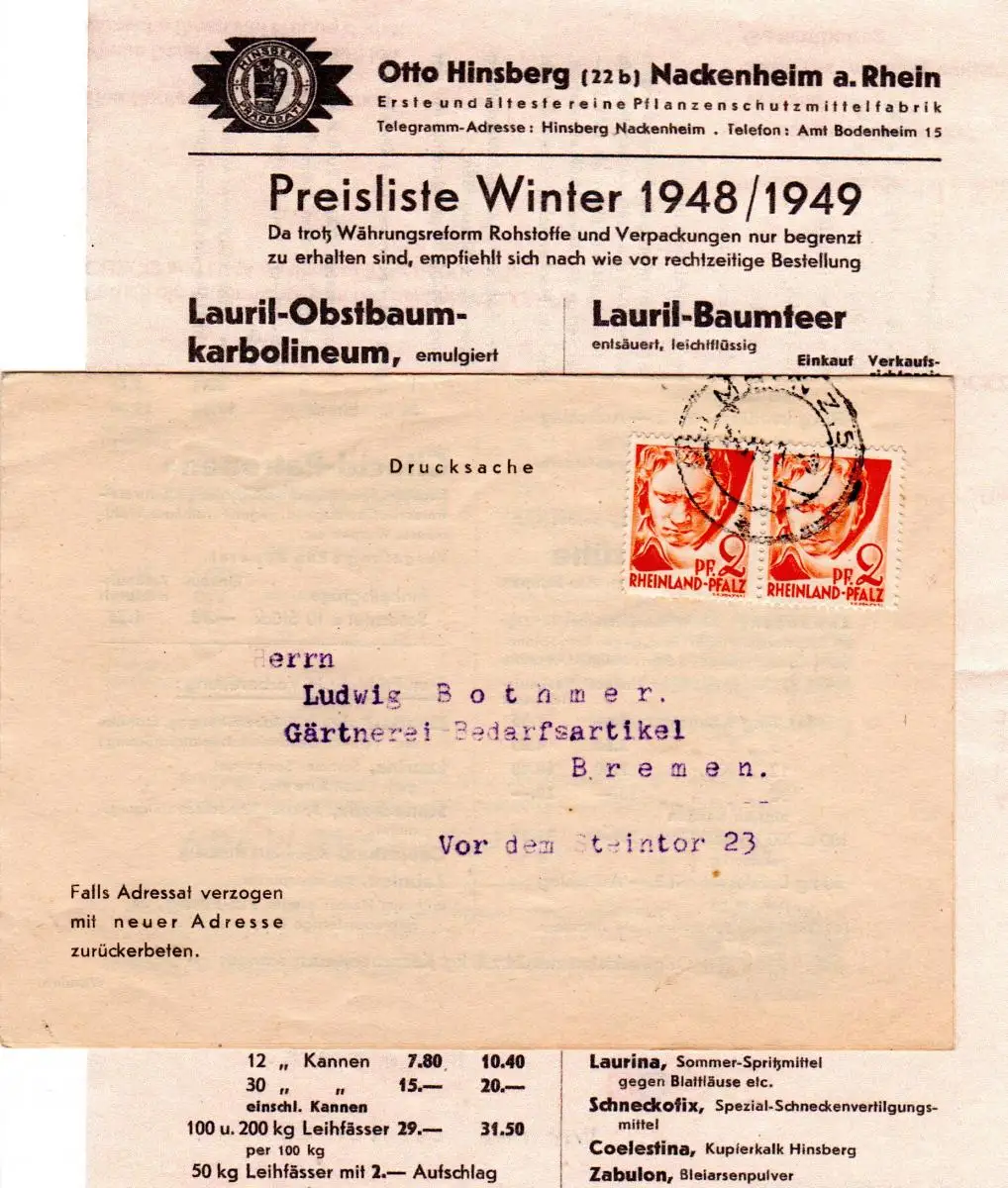 Franz. Zone 1948, MeF 2x2 Pf. Rheinland-Pfalz auf Faltdrucksache v. Nackenheim