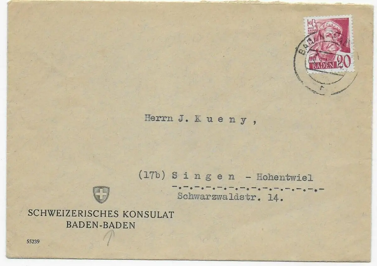 nach Singen. Konsulatpost war von der Zuschlags-Marke befreit.