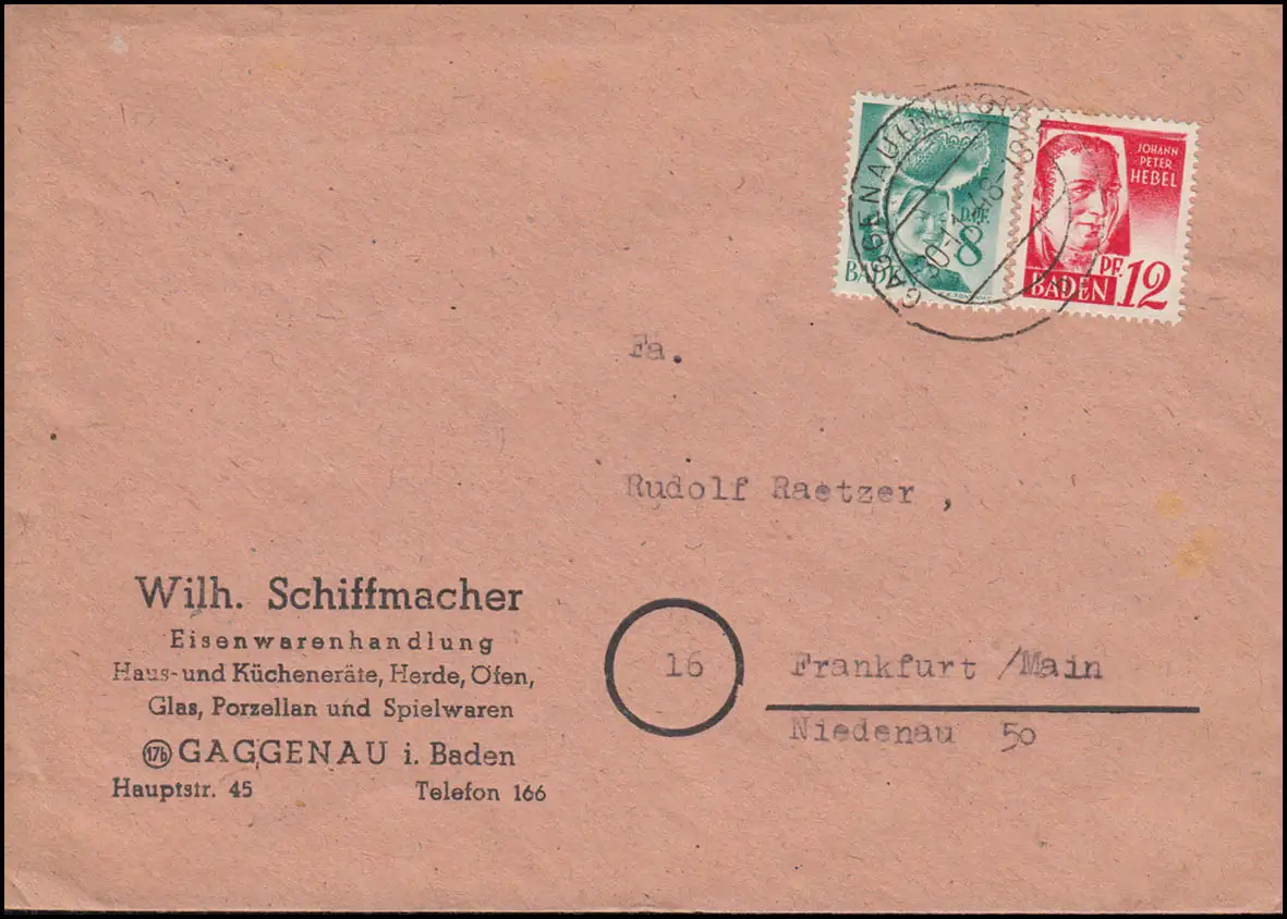 portogerechte Mischfrankatur auf Fernbrief der Firma Eisenwarenhandlung Schiffmacher in Gaggenau / Baden nach Frankfurt / Main