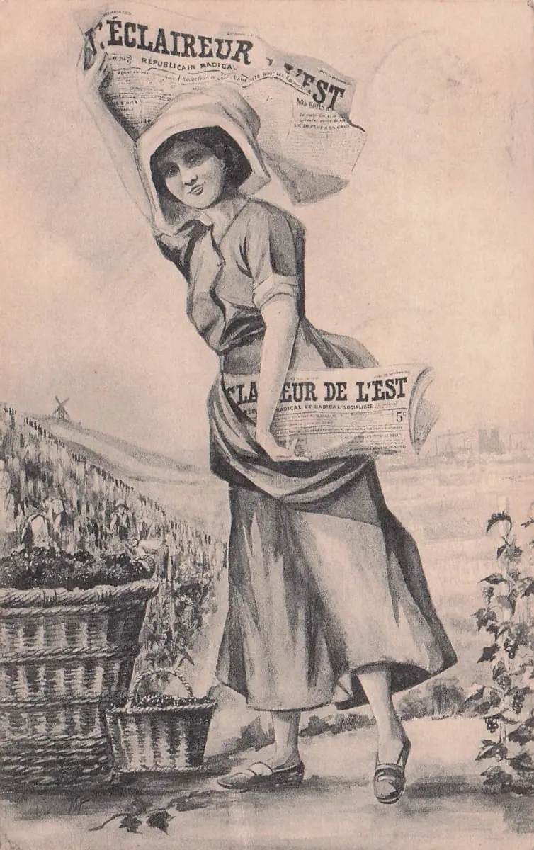 Frau im Stil der Belle Époque oder des Art Nouveau, die eine Zeitung trägt. Der Stil erinnert an die Zeit um die Jahrhundertwende vom 19. zum 20. Jahrhundert. -798042