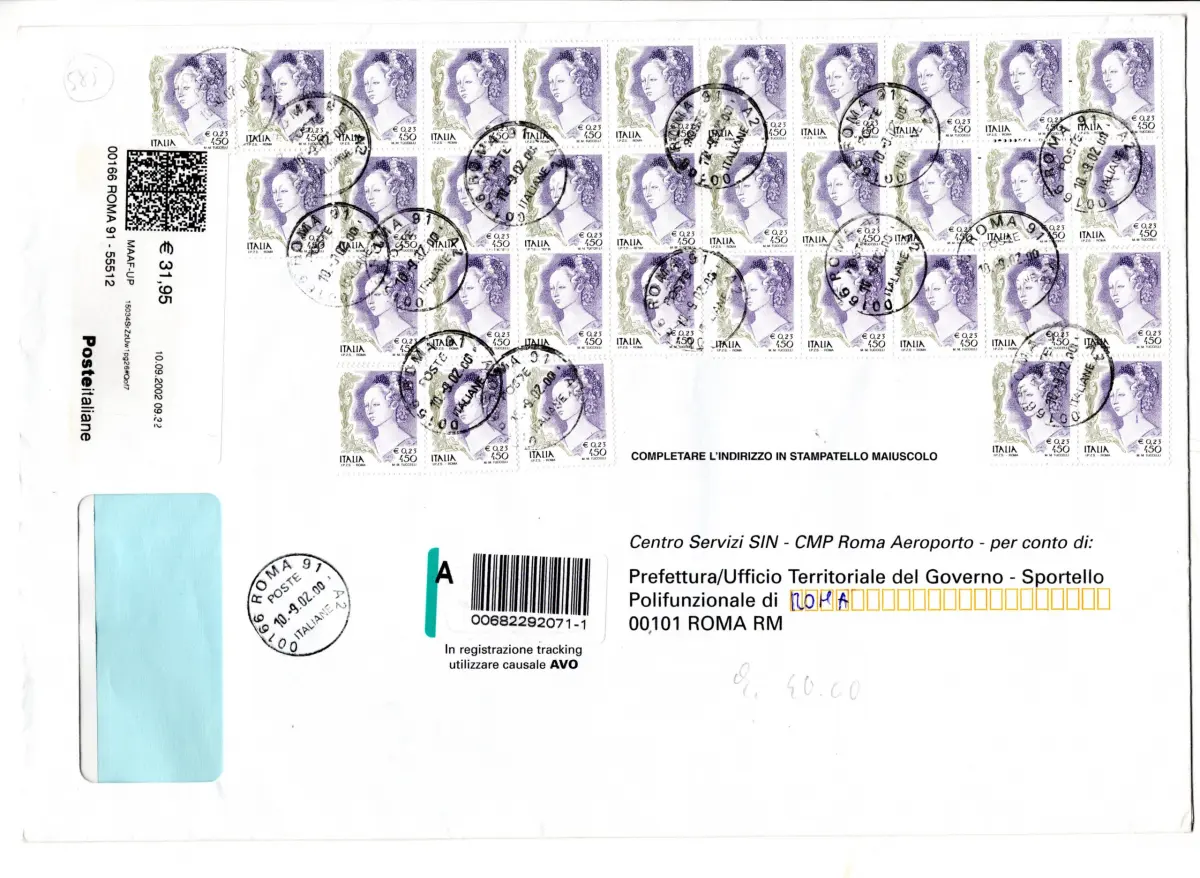 TASCHE - Frau in der Kunst Lire 450 / Euro 0,23 Nr. 2394 35 Exemplare + P.T. Etikett zur Ergänzung Tarif von 31,95 Euro auf versichertem Umschlag (Antrag auf Regularisierung von Hausangestellten), der am 10.9.2002 von Rom in die Stadt versandt wurde - Außergewöhnliches Steuerpostfrankatur am ersten Tag des kurzen Tarifzeitraums, der zur Regulierung von Nicht-EU-Arbeitnehmern nützlich ist (Zeitraum dieser Tarife vom 10.9.2002 bis 11.11.2002) - Interessant für Sammler Postgeschichte dieser Ausgabe Cod.455/182