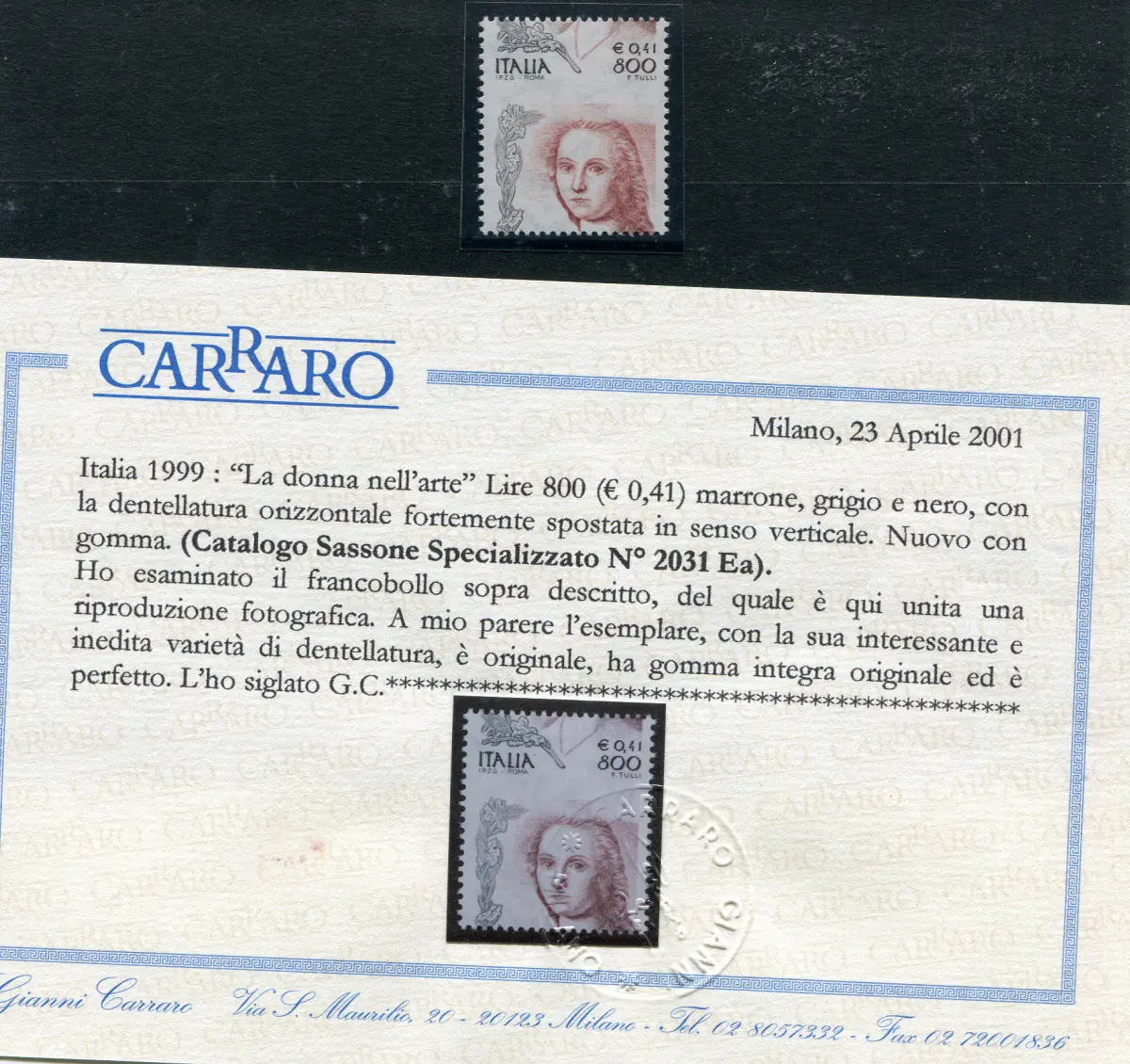 Frau in der Kunst Lire 800 / Euro 0,41 Sorte Zahnung Vollgummi - MHN - - - Frau in der Kunst Lire 800 / Euro 0,41 Nr. 2396 stark verschobene horizontale Verzahnung (Sass. spec. Nr. 2031 Ea) - Wertvolle Sorte für diese beidseitige Ausgabe - Cert. Carraro Cod. 817/14