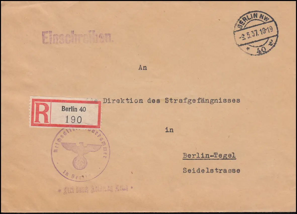 an die Direktion des Strafgefängnisses in Berlin-Tegel, Ankunftsstempel BERLIN 10.3.37