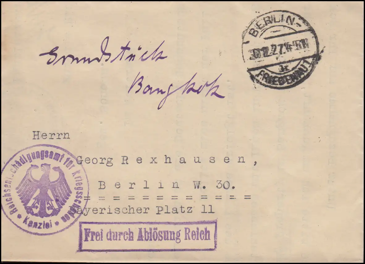 Frei durch Ablösung Reichsentschädigungsamt für Kriegsschäden BERLIN 20.12.1927
