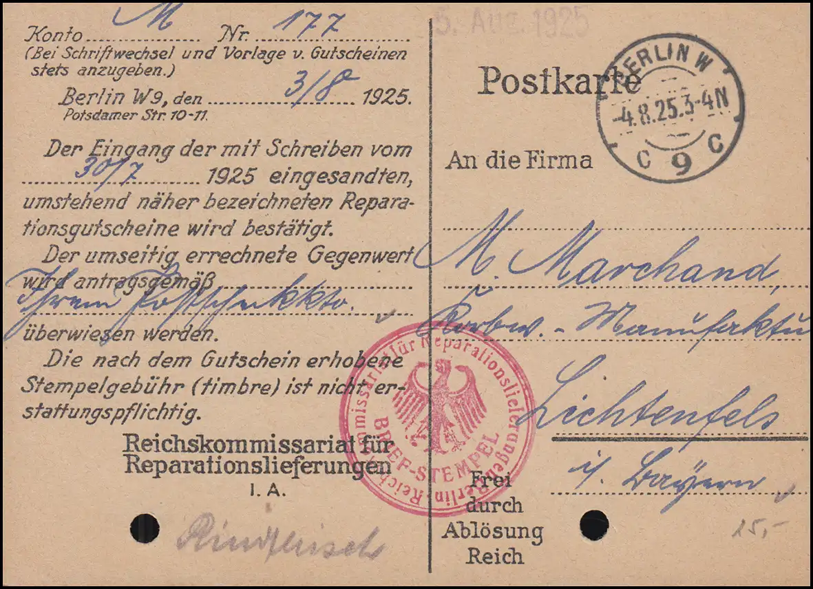 Frei durch Ablösung Reichskommissariat Reparationslieferungen BERLIN 4.8.1925