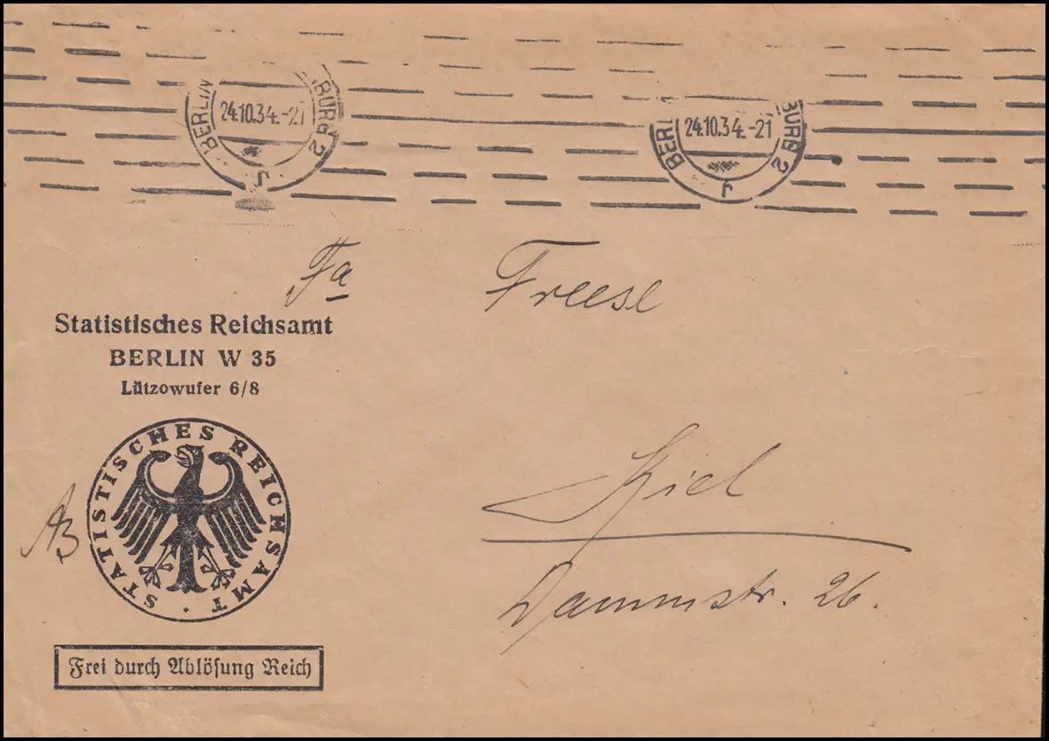 Frei durch Ablösung Statistisches Reichsamt BERLIN-CHARLOTTENBURG 24.10.1934