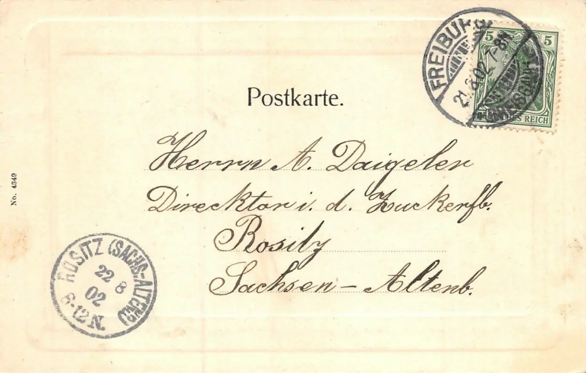 Rückseite: gelaufen 1902 von Freiburg (Breisgau) nach Rositz (Sachs.-Altenb.)