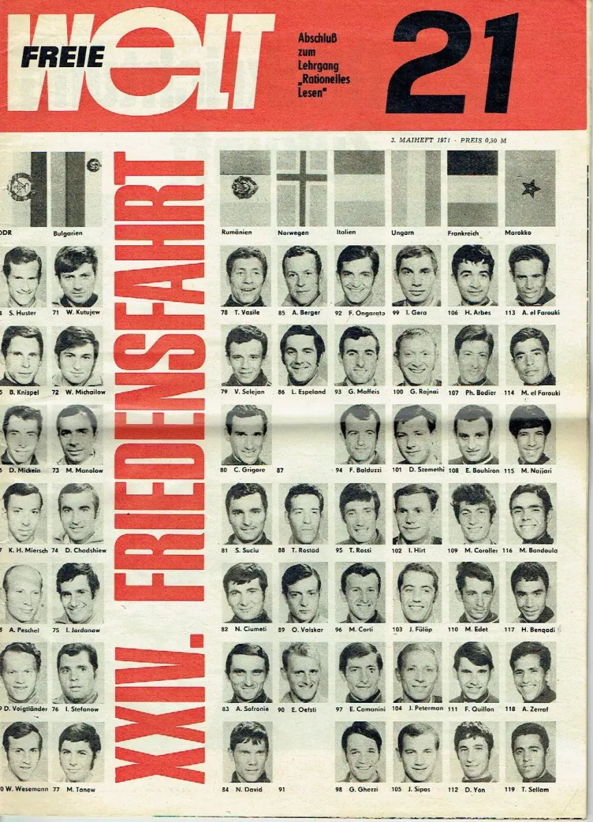 guter bis sehr guter Zustand, geringe Gebrauchs- und Alterungsspuren: Papier teils etwas vergilbt, aber Seiten sauber und ordentlich - teils etwas eselsohrig - kleine Blessuren - mittig quer gefalten, Zeitung der DDR enthält u. a. Reklame, Romane, Kurzerzählungen, Rätsel, Karikaturen, Reportagen, Artikel über DDR-Politik, Sport und Leben, Technik und Wissenschaft, Reportagen aus der deutschen, sowjetischen und internationalen Geschichte und dem Fernsehprogramm der Woche etc. hier zusätzlich auf den beiden Umschlagseiten kleine Fotos aller Teilnehmer der Friedensfahrt, Softcover, ca. 26 x 36 cm, 40 Seiten mit zahlreichen Bildern