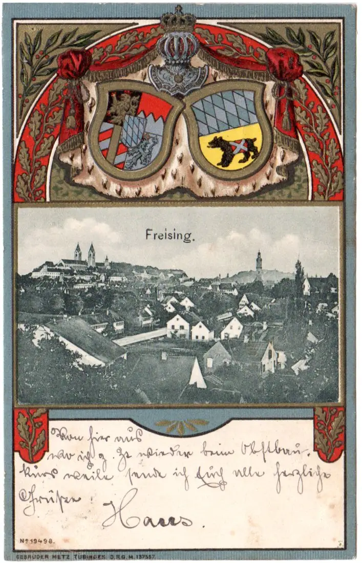 Freising, schöne Präge-Karte m. Wappen u. Gesamtansicht, 1901 gebr. AK