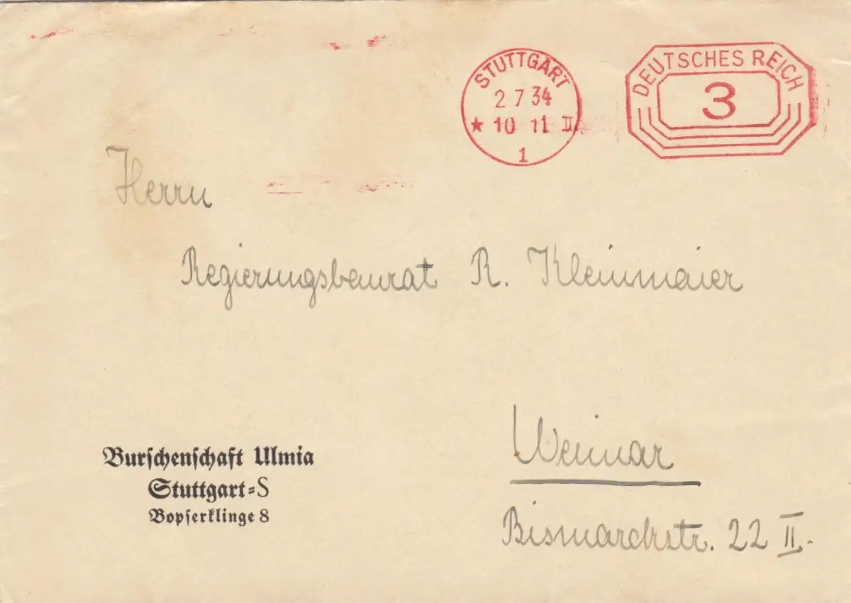 Freistempel 1934: Burschenschaft Ulmia, Stuttgart nach Weimar