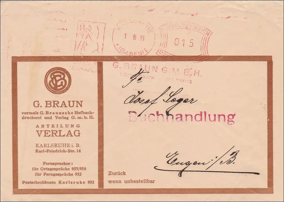 Freistempel: Buchhandlung Karlsruhe nach Engen 1933