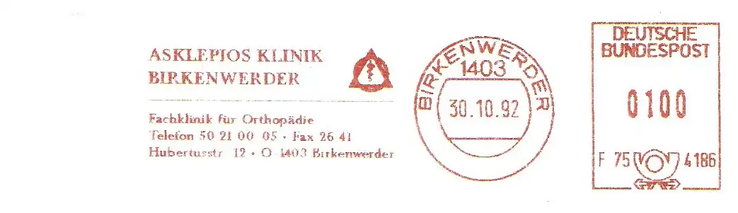 Freistempel F75 4186 Birkenwerder (VGO) - ASKLEPIOS KLINIK BIRKENWERDER - Fachklinik für Orthopädie (Abb. Äskulapnatter) (#2650)