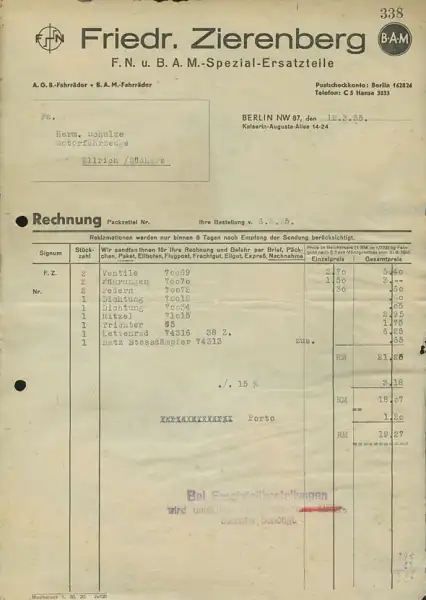 Friedr. Zierenberg FN / BAM Rechnung von 1935