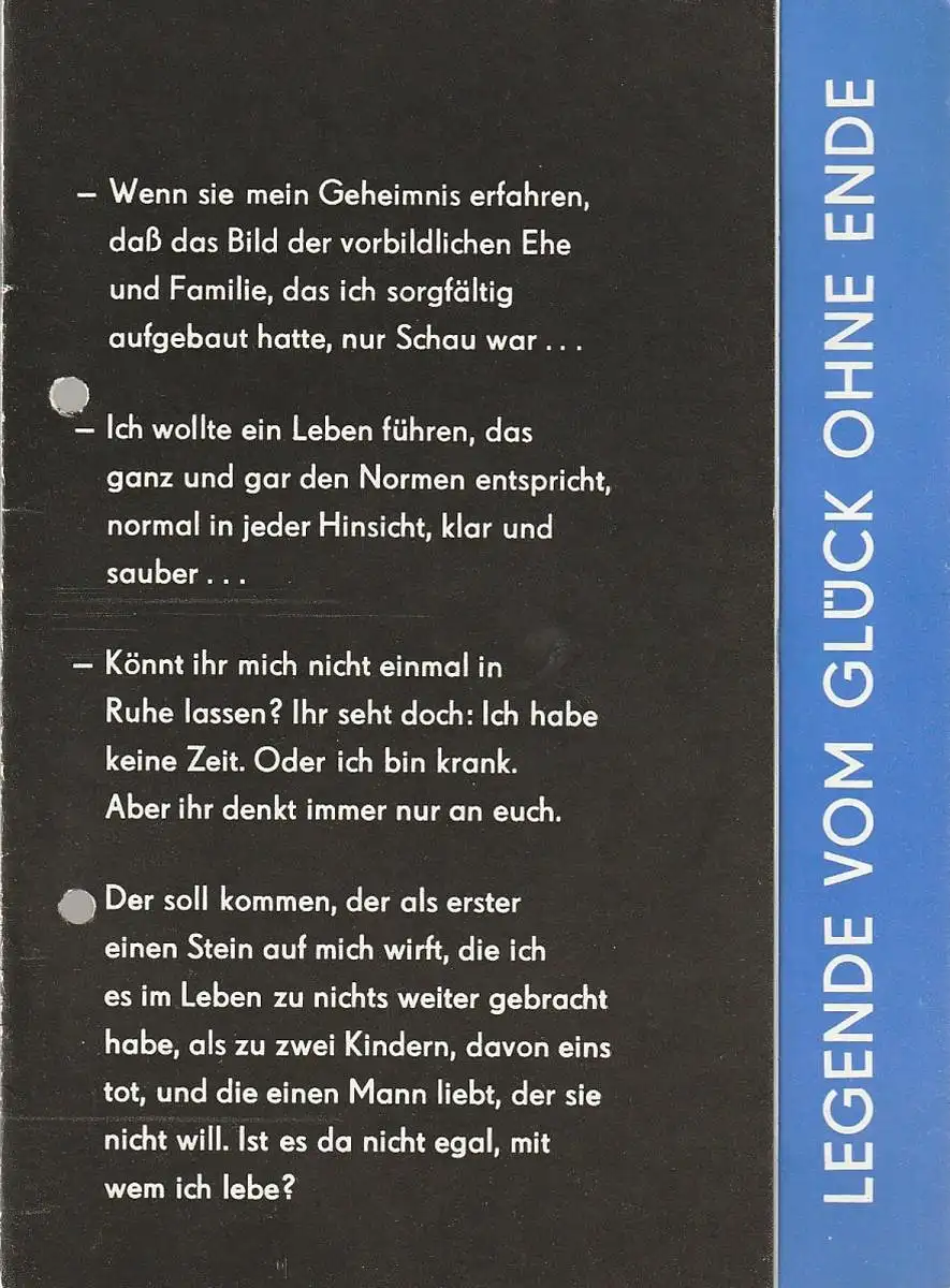 Spiel nach dem gleichnamigen Roman. Regie: Angelika Heimlich. Ausstattung: Horst-Werner Schneider. Musik: Rolf Fischer. Mitwirkende: Ralf Schlösser, Irene Kleinschmidt, Romy Nickiewicz, Klaus Kriese, Dietmar Lahaine, Gerhard Kähling, Norbert Braun, Karl-Ludwig Treu, Gerd Opitz, Bettina Mahr, Falk Rockstroh - Theaterprogramm, Opernprogramm, Ballettprogramm, Musicalprogramm, Konzertprogramm, Theatermemorabilia, Programmhefte Sammlung, deutsche Theatergeschichte.