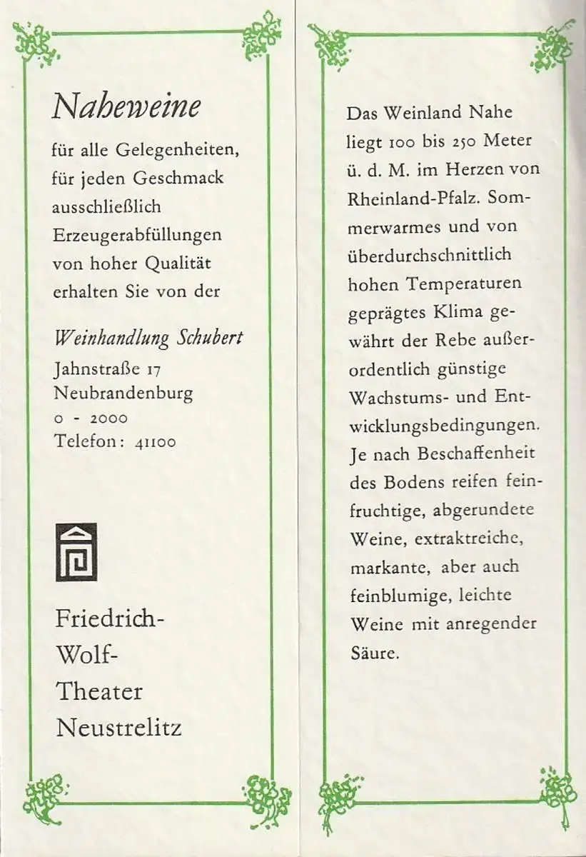 Friedrich-Wolf-Theater Neustrelitz/Mecklenburg, Im Auftrag der Intendanz, Michael Giebler, Klaus Weindisch: Programmheft WEIN, WEIB UND GESANG TIF Theater im Foyer Programmheft Nr. 24 1990.