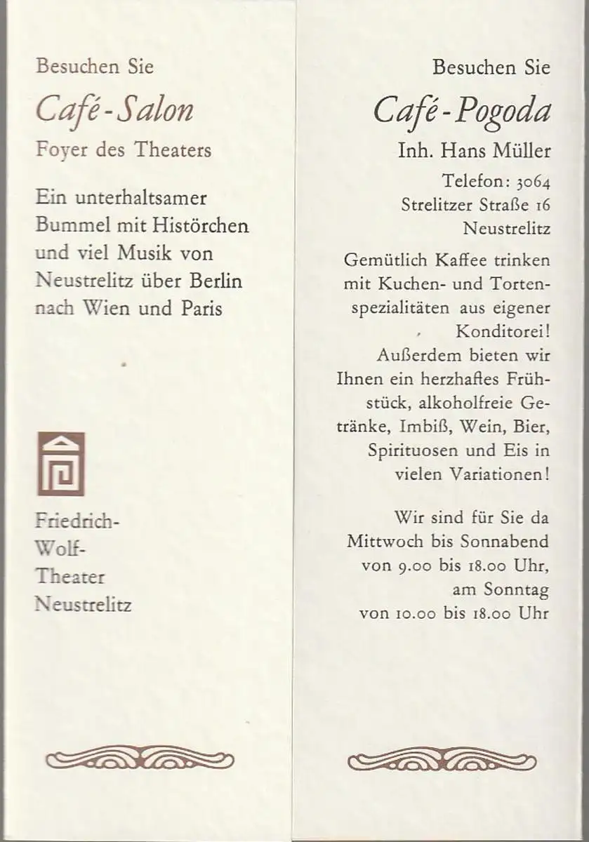 Ein unterhaltsamer Bummel mit Histörchen und viel Musik von Neustrelitz über Berlin nach Paris.Ein musikalisch-theatralischer Bummel durch Cafes. Idee, Texte und Auswahl der Histörchen: Sieglinde Wiegand, Ulrike Pörner. Gestaltung: Horst Mamerow. Mitwirkende: Gabriele Borowy, Helmut-Michael Kraus, Gabi Thomann, Sylke Kamin, Thomas Höhne. Programm: mehrere Lieder und Klavier, u. a. Wiener Lieder - Theaterprogramm, Opernprogramm, Ballettprogramm, Musicalprogramm, Konzertprogramm, Theatermemorabilia, Programmhefte Sammlung, deutsche Theatergeschichte.