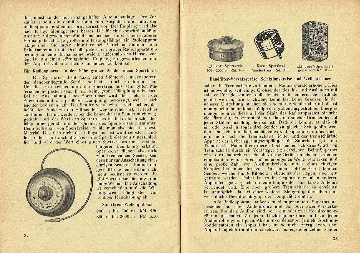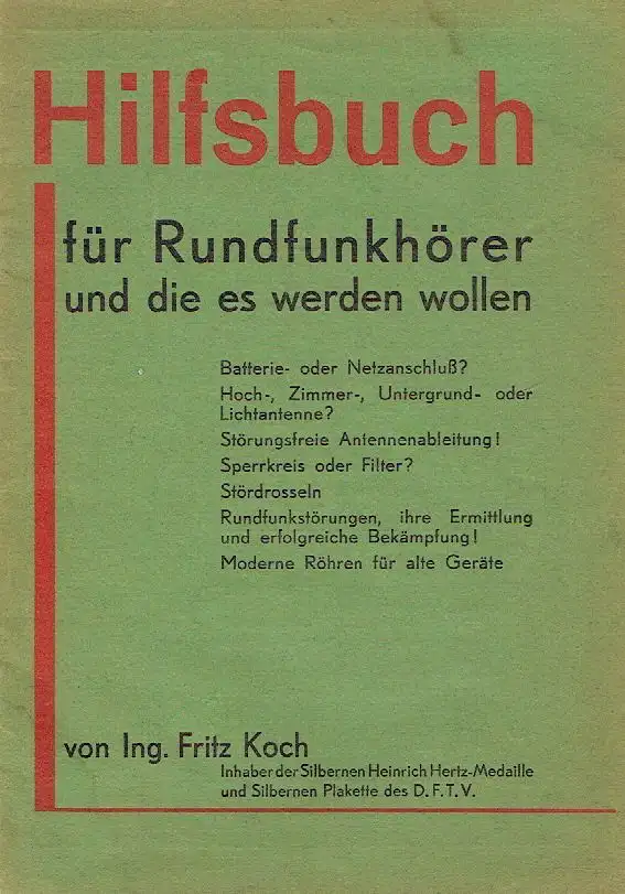 sehr guter Zustand, geringe Gebrauchs- und Alterungsspuren: Papier teils etwas vergilbt, aber Seiten sauber und ordentlich - Umschlag und Seiten teils etwas eselsohrig - Deckel mit Fleck an der oberen Ecke und 3 kleinen Einrissen im rechten Rand, da auch 2x leicht angeknickt, Batterie- oder Netzanschluß?Hoch-, Zimmer-, Untergrund- oder Lichtantenne?Störungsfreie Antennenableitung!Sperrkreis oder Filter?StördrosselnRundfunkstörungen, ihre Ermittlung und erfolgreiche Bekämpfung!Moderne Röhren für alte Geräte "Störungsfreier Rundfunkempfang ist der Wunsch aller Rundfunkhörer. Einen Radioapparat kauft man, Rundfunkstörungen erhält man in beliebiger Menge gratis zu. Mit diesen Störungen fertig zu werden, ist oft eine schwierige Sache, und oft schon ist den Störungen zuliebe der Radioapparat wieder abgeschafft worden, oder nach kurzer Probezeit hat der Händler den Apparat zurückerhalten. Je länger man einen Radioapparat besitzt, um so mehr Störungen lernt man kennen und um so besser lernt man diese unterscheiden. Oft wird die Schuld dem Radioapparat zugeschoben und der Apparat wird in einen größeren umgetauscht. Dieser bringt aber meist die Störungen noch lauter und noch andere Störungen dazu. Der alte Apparat trennte meist die Sender besser als der neue teurere und nun werden Sperrkreise, Filterkreise, Drosseln, Spiralantennen und Tonfilter gekauft und meist nach kurzer erfolgloser Probe in den Tischkasten gelegt oder dem Radiohändler zum Umtausch zurückgebracht. Der eine hört zu wenig, der andere hört zu viel, der eine alles durcheinander und der andere muß vor lauter Störungen ganz ausschalten. Unzufriedenheit überall, wo ein Radioapparat steht, und in den Fach- und Programmzeitungen überbieten sich die Inserate: „Trennscharfen Rundfunkempfang", „Störungsfreien Radioempfang", „Endlich erfolgreiche Störbeseitigung" usw. Wenn es das jetzt gibt, so wird es ja auch bald Apparate geben, wo all diese Neuheiten eingebaut sind, könnte man sagen. Leider aber ist es anders. Zur Bekämpfung der bekannten Rundfunkstörungen und zur Erreichung eines einwandfreien Rundfunkempfanges, bedarf es einer Reihe individueller Beobachtungen, nach denen man den Apparat bedienen muß, oder die Benutzung eines Zusatzgerätes empfehlenswert ist. Diese Möglichkeiten kann der Konstrukteur des Radioapparates nicht berücksichtigen, denn der Wunsch des Käufers ist in erster Linie ein Radioapparat mit Einknopfbedienung. Auch weiß der Konstrukteur nicht, wo der Radioapparat aufgestellt wird und wie die Empfangsverhältnisse am Aufstellungsorte sind. Die Konkurrenz zwingt ihn Apparate zu bauen, die für wenig Geld möglichst viel leisten. Der Einbau besonderer Zusatzapparate für vereinzelte Fälle würde die Apparate verteuern und den Verkauf dadurch erschweren. Der Zweck dieses Heftchens soll nun sein, dem Leser alle Möglichkeiten zu zeigen, die es gibt um den Rundfunkempfang zu verbessern und wenn nötig, auf die richtigen Zusatzgeräte hinzuweisen, welche notwendig sind, um einen möglichst störungsfreien und trennscharfen Radioempfang zu erzielen.", kartoniert, ca. 15 x 21, 48 Seiten mit einigen Bildern