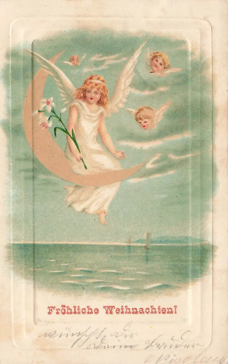 Fröhliche Weihnachten! Engelskind Flügel Halbmond Meer Boote Postkarte AK