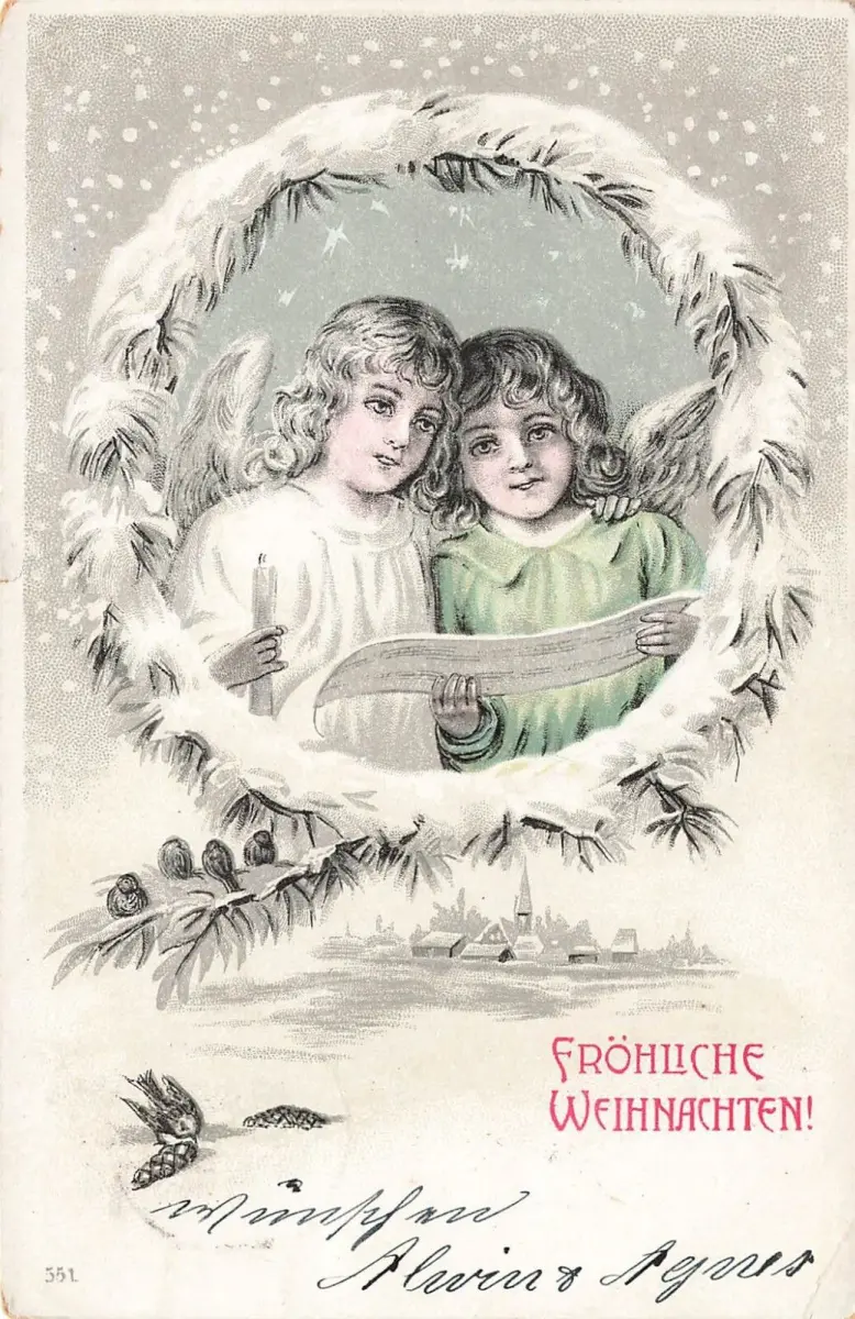Fröhliche Weihnachten Schnee Dorf Kinder Engel Kerze Postkarte AK 1904
