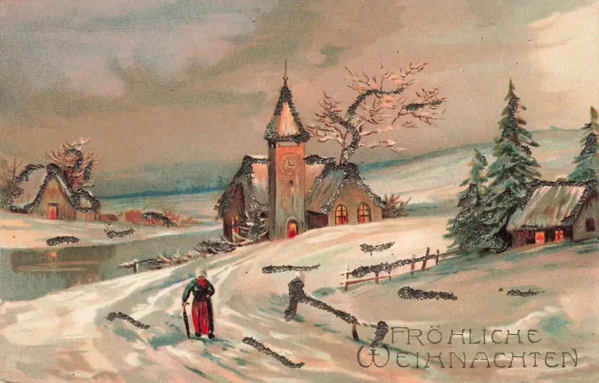 Fröhliche Weihnachten schneebedeckte Häuser Kirche Landschaft Postkarte AK