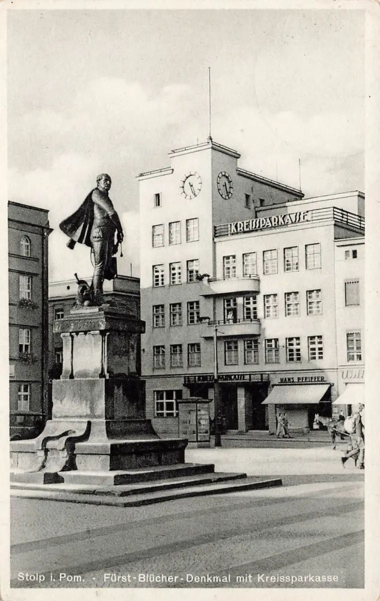 Fürst Blücher-Denkmal mit Kreis Sparkasse in Stolp Słupsk Pommern Postkarte AK
