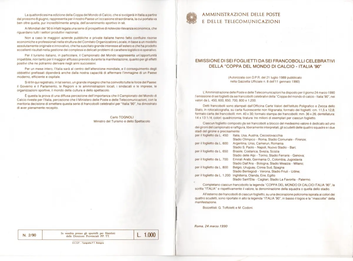 FRAGMENT - Calcio Italia '90 Das Ministerialbulletin zur Präsentation der neuen Ausgabe mit der Serie der sechs verschiedenen Zettel, die am ersten Ausgabetag mit der Briefmarke Roma Philatelico annulliert wurden - Ungewöhnlich, Gelegenheit für Sammler zum Thema Fußball Cod.463/182